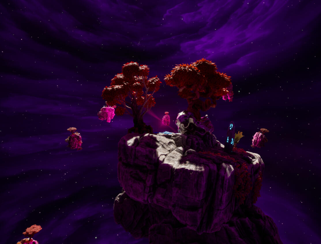 The core of the effects is a cube render target pointing at a bubble of floating islands in a space-like environment. The Islands bob up and down with semi-random speeds and timings to seem more natural, and there is also a panning cloud texture to add further depth to this scene.Using a cube render target here allows me to feed the camera’s reflection vector as the UV map, which makes it seem like the player is standing at the centre of this scene regardless of where they’re actually positioned.