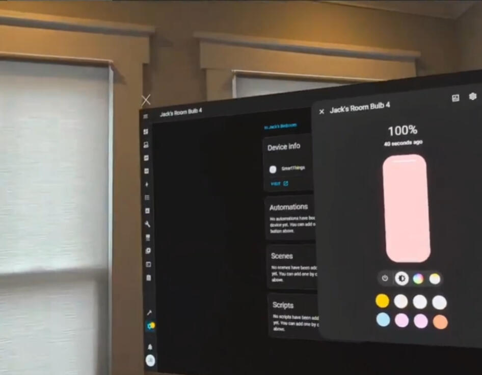 Home Assistant: XR (or HAXR) is a mixed reality application that allows someone to map their devices in Home Assistant (an open source Smart Home platform) to their physical space.This allows someone to, say, turn on a TV by physically tapping it, or use a virtual colour slider to adjust their lights in real time, etc.