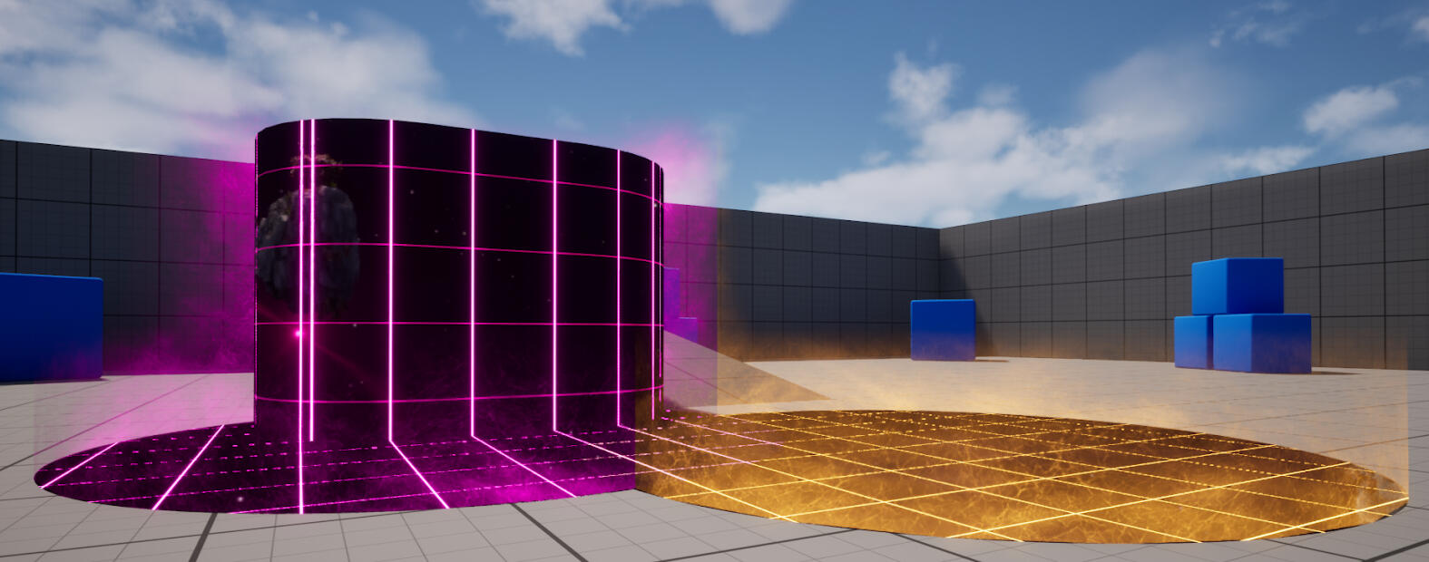 This is the cubemap that is fed into the decals that spawn when the projectile lands. The other half of the decal effect is a cylinder that seems to radiate off the edges of whatever surface the decal has been projected onto.This effect is achieved by getting the distance from the surface and using that to set the transparency, then getting the normal of the nearest surface, and using that to power the direction of the panning ‘energy’ texture.To make sure the cylinders don’t overlap in unsightly ways, all of the cylinders are actually stored in one, dynamic mesh actor, that uses boolean mesh operations whenever a new decal spawns, to make sure the energy-radiating effect only appears on the edges of the decals.