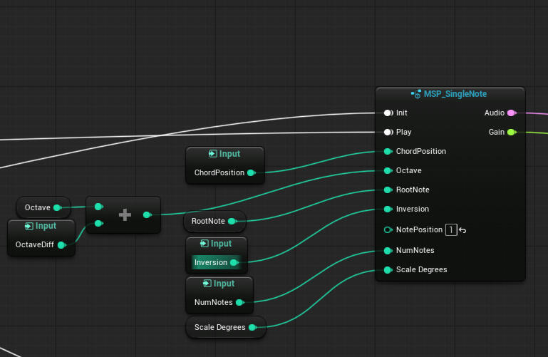 When the main projectile makes impact, it spawns a cylinder of music, which plays through a looping chord progression (literally an array of integers), with the root note being the bottom note you played when firing the projectile, and the number of notes in the chord being the number of notes you played.The timing is all driven by a single "Master Actor" running a Quartz clock to keep everything in sync, regardless of an individual "Music Zone's" spawn time.