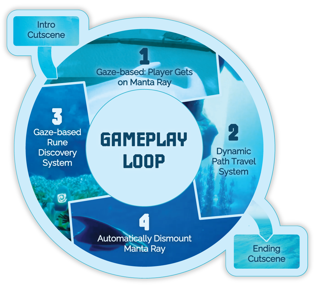 The game features a tour of an ancient underwater city, from the back of a magical manta ray — fittingly named Manta. Players stop at various key destinations to find and collect magical rune stones hidden somewhere in the scenery. Players must focus their gaze on a rune stone for 10 seconds to collect it, at which point Manta takes the player to the next vignette. At the end of their journey, all the collected stones come together, raising a tower from beneath the sand, and sending it spiraling up towards the sky. The Manta and the player spiral up with it, letting them take to the sky and fly among the clouds to end the experience.